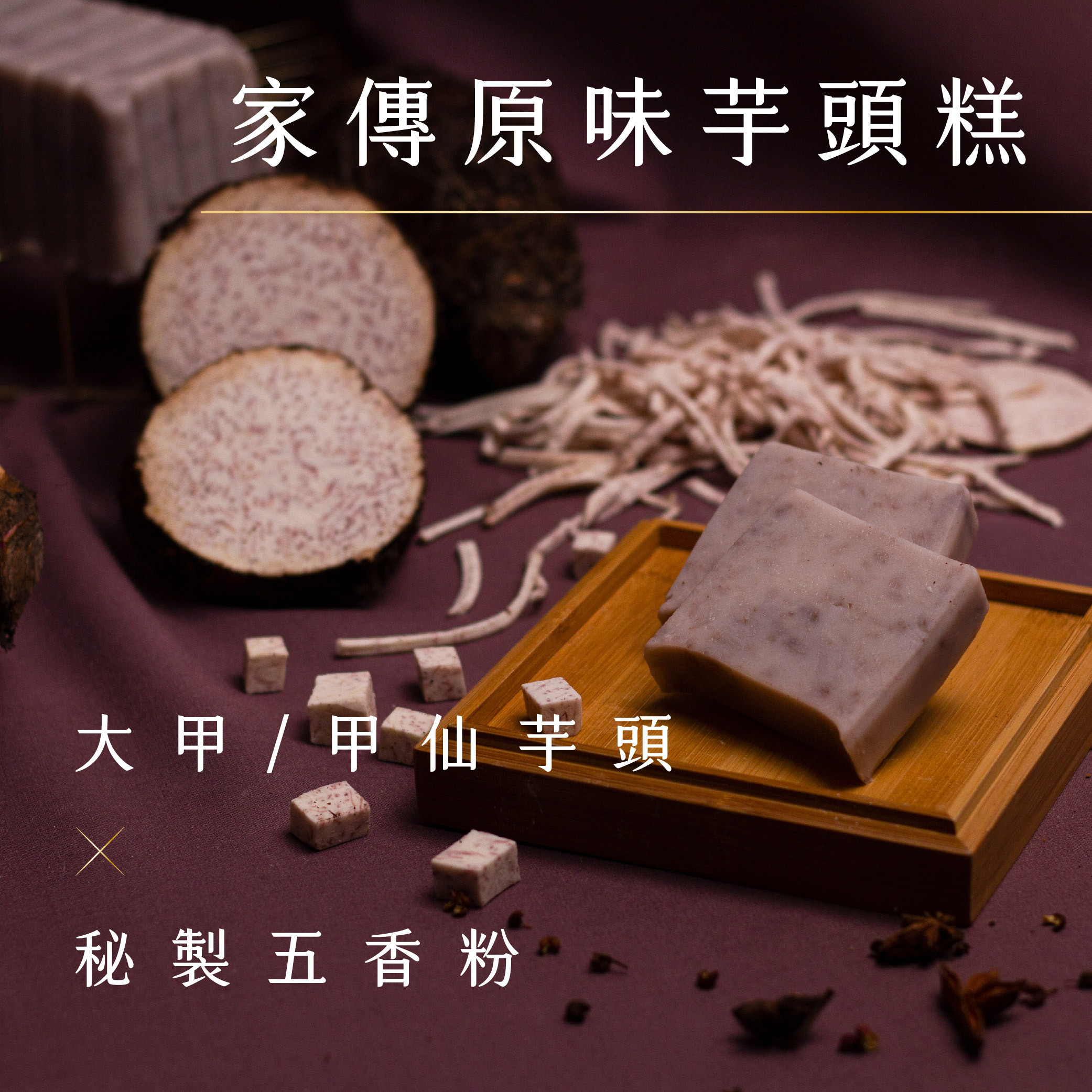 依照不同產季,我們選用「大甲芋頭」、「甲仙芋頭」兩種芋頭作為原料,它們的肉質較為細膩,不僅口感綿密鬆軟,芋頭獨特的濃郁香氣與米漿的融合更是一絕。濃郁香醇的大甲芋頭與秘製五香粉的完美結合,不僅提升了芋頭糕的風味,飽滿紮實的芋頭內餡絕對讓你愛不釋口。
